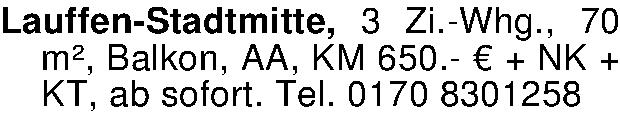Lauffen-Stadtmitte, 3 Zi.-Whg., 70 m², Balkon, AA, KM 650.- € + NK + KT, ab sofort. Tel. 0170 8301258