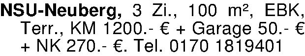 Anzeigentitel: NSU-Neuberg, 3 Zi., 100 m², EBK, Terr., KM 1200.- € + Garage 50.