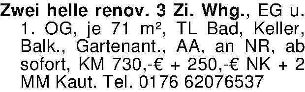 Anzeigentitel: Zwei helle renov. 3 Zi. Whg., EG u. 1. OG, je 71 m², TL Bad, Kel