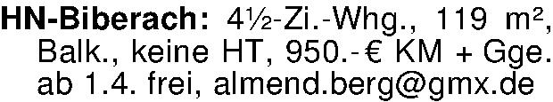 Anzeigentitel: HN-Biberach: 4 1/2-Zi.-Whg., 119 m², Balk., keine HT, 950.-€ KM