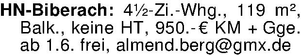 Anzeigentitel: HN-Biberach: 4 1/2-Zi.-Whg., 119 m², Balk., keine HT, 950.-€ KM