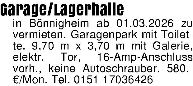 Anzeigentitel: Garage/Lagerhallein Bönnigheim ab 01.03.2026 zu vermieten. Garag