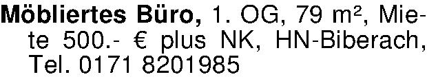 Möbliertes Büro, 1. OG, 79 m², Miete 500.- € plus NK, HN-Biberach, Tel. 0171 8201985