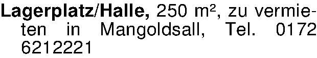 Lagerplatz/Halle, 250 m², zu vermieten in Mangoldsall, Tel. 0172 6212221