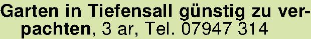 Anzeigentitel: Garten in Tiefensall günstig zu verpachten, 3 ar, Tel. 07947 314