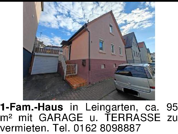 1-Fam.-Haus in Leingarten, ca. 95 m² mit GARAGE u. TERRASSE zu vermieten. Tel. 0162 8098887