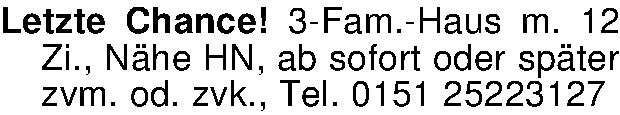 Letzte Chance! 3-Fam.-Haus m. 12 Zi., Nähe HN, ab sofort oder später zvm. od. zvk., Tel. 0151 25223127