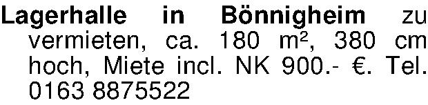 Lagerhalle in Bönnigheim zu ­vermieten, ca. 180 m², 380 cm hoch, Miete incl. NK 900.- €. Tel. 0163 8875522
