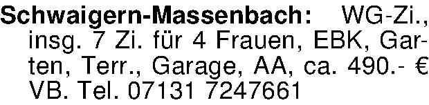 Schwaigern-Massenbach: WG-Zi., insg. 7 Zi. für 4 Frauen, EBK, Garten, Terr., Garage, AA, ca. 490.- € VB. Tel. 07131 7247661