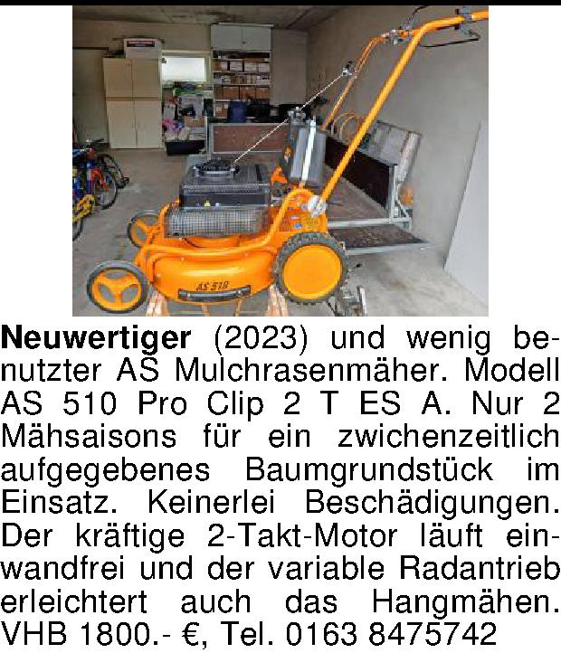 Anzeigentitel: Neuwertiger (2023) und wenig benutzter AS Mulchrasenmäher. Model