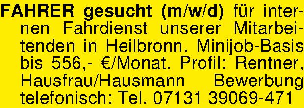 FAHRER gesucht (m/w/d) für internen Fahrdienst unserer Mitarbeitenden in Heilbronn. Minijob-Basis bis 556,- €/Monat. Profil: Rentner, Hausfrau/Hausmann Bewerbung telefonisch: Tel. 07131 39069-471
