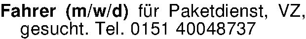 Anzeigentitel: Fahrer (m/w/d) für Paketdienst, VZ, gesucht. Tel. 0151 40048737