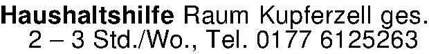 Anzeigentitel: Haushaltshilfe Raum Kupferzell ges. 2 - 3 Std./Wo. Tel. 0177 612