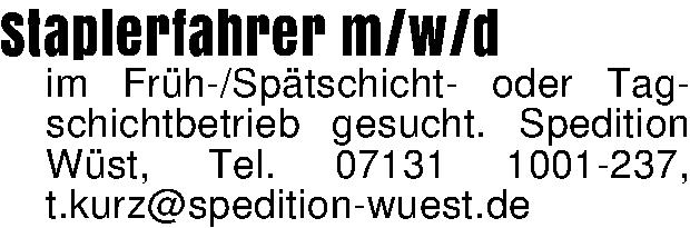 Staplerfahrer m/w/d im Früh-/Spätschicht- oder Tagschichtbetrieb gesucht. Spedition Wüst, Tel. 07131 1001-237, t.kurz@spedition-wuest.de