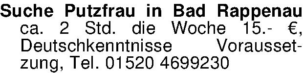 Anzeigentitel: Suche Putzfrau in Bad Rappenau ca. 2 Std. die Woche 15.- €, Deut