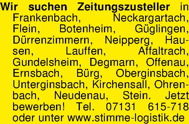 Wir suchen Zeitungszusteller in Frankenbach, Neckargartach, Flein, Botenheim, Güglingen, ­Dürrenzimmern, Neipperg, Hausen, Lauffen, Affaltrach, ­Gundelsheim, Degmarn, Offenau, Ernsbach, Bürg, Oberginsbach, Unterginsbach, Kirchensall, Ohrenbach, Neudenau, Stein. Jetzt ­bewerben! Tel. 07131 615-718 oder unter www.stimme-logistik.de