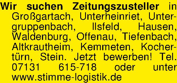 Wir suchen Zeitungszusteller in Großgartach, Unterheinriet, Untergruppenbach, Ilsfeld, Hausen, ­Waldenburg, Offenau, Tiefenbach, Altkrautheim, Kemmeten, Kochertürn, Stein. Jetzt ­bewerben! Tel. 07131 615-718 oder unter www.stimme-logistik.de