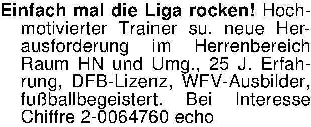 Anzeigentitel: Einfach mal die Liga rocken! Hochmotivierter Trainer su. neue He