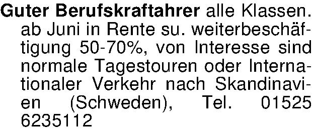 Guter Berufskraftahrer alle Klassen. ab Juni in Rente su. weiterbeschäftigung 50-70%, von Interesse sind normale Tagestouren oder Internationaler Verkehr nach Skandinavien (Schweden), Tel. 01525 6235112