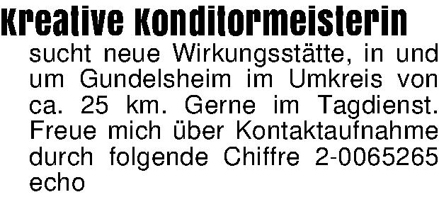 Kreative Konditormeisterinsucht neue Wirkungsstätte, in und um Gundelsheim im Umkreis von ca. 25 km. Gerne im Tagdienst. Freue mich über Kontaktaufnahme durch folgende Chiffre 2-0065265 echo