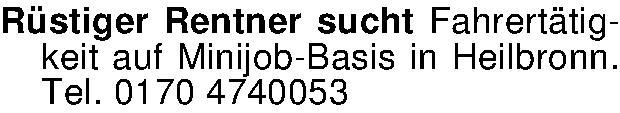 Rüstiger Rentner sucht Fahrertätigkeit auf Minijob-Basis in Heilbronn. Tel. 0170 4740053